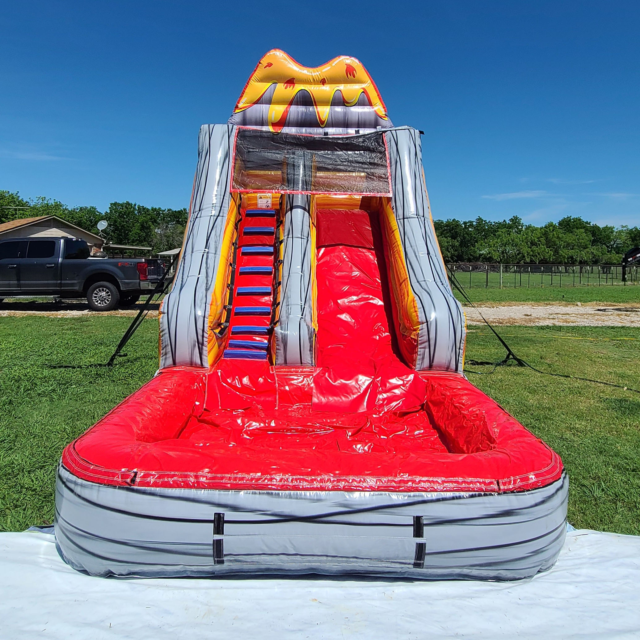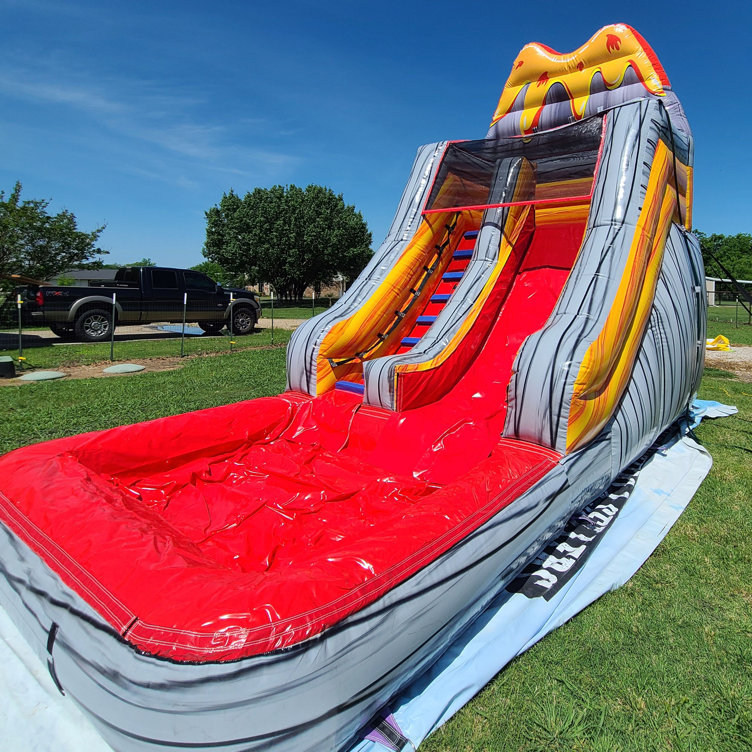 The Volcano slide is a 16ft fast thrilling slide! Climb to the top and experience the rush while speeding down to the splash pool. Please be careful while playing with lava 😉